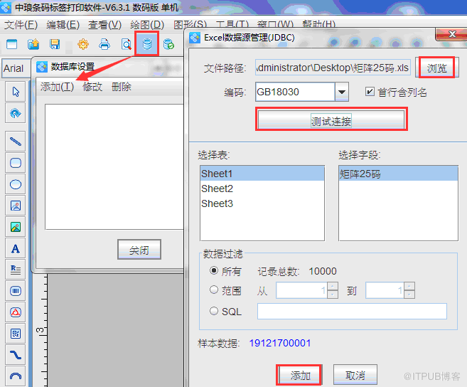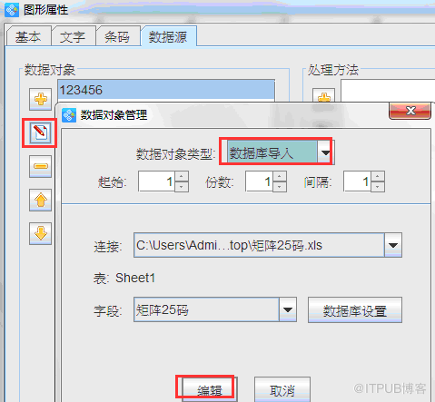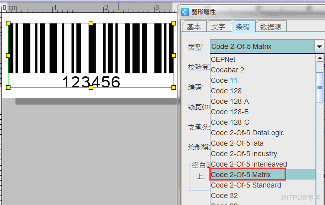 打开条形码的属性,修改条码类型为“Code 2 of 5 Matrix”,在数据源中修改矩阵25码的默认数据,选择数据库导入矩阵25码数据。