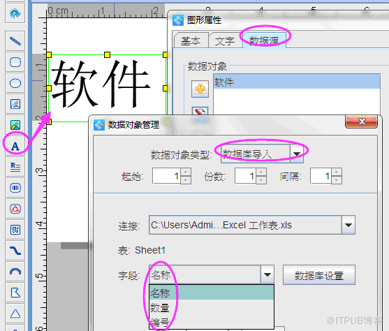 Excel表通过数据库导入之后,就可以在条码打印软件中添加普通文本,条码,二维码进行调用了。
