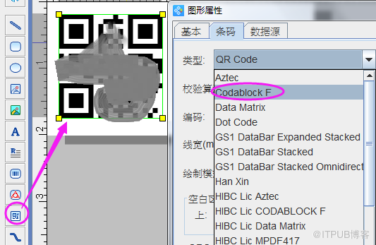 在空白标签上添加一个普通的二维码,并打开二维码属性,二维码类型选择为Codablock F。