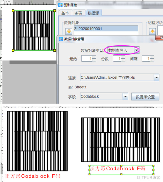 在数据源中修改Codablock F码数据,数据对象类型选择数据库导入。Codablock F二维码的外观不局限于正方形,也可以手动调整为长方形。