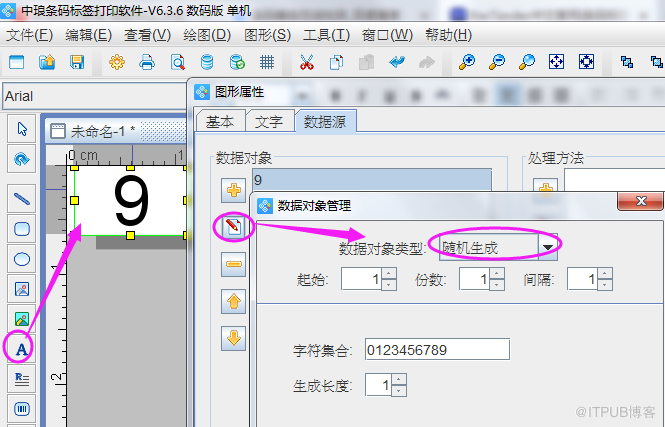 在条码软件中绘制一个普通文本,打开普通文本的属性-数据源,修改当前默认数据,数据对象类型选择“随机生成”,字符集默认为“0123456789”,不需要修改,长度设置为1。这样的话就可以在字符集“0123456789”中随机生成0-9个位数字。
