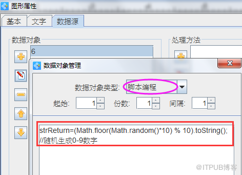条码软件中另一种随机生成0-9个位数字的方法就是脚本编程,利用脚本实现随机生成0-9数字。数据对象类型选择“脚本编程”,在输入框中输入代码: