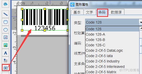 绘制一个 条形码,打开条形码的属性-条码选项选择条形码类型( 条码生成软件 支持近百种常见条形码类型)。