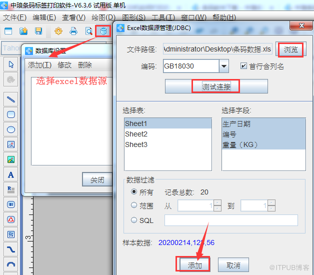 打开条码生成软件,新建一个空白标签,通过 数据库导入 excel文件,这里要注意是需要把excel中的三列都导入(默认的是全选,所以不需要选择,直接添加即可)。