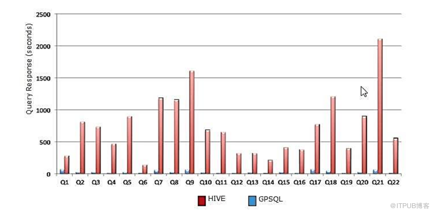 基于以上不同,体现在效率、功能特性等方面也大不相同。Greenplum 数据库在计算并行度、计算算法上比Hadoop 更加优雅,效率更高。图3-11 由Pivotal 提供,显示相同硬件环境下,基于MapReduce 的Hive 和Greenplum 在TPC-H (商业智能测试)22 个SQL 测试中的性能比较,可以看到两者的执行速度相去甚远。