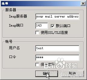 四、然后再在outlook express工具菜单中的winmail客户端扩展工具中选择你的winmail帐号,就会出现设置页面。outlook2003 有些特别,需要输入用户的密码,注意还有imap服务器的地址不能错,就是你的winmail服务器的地址。