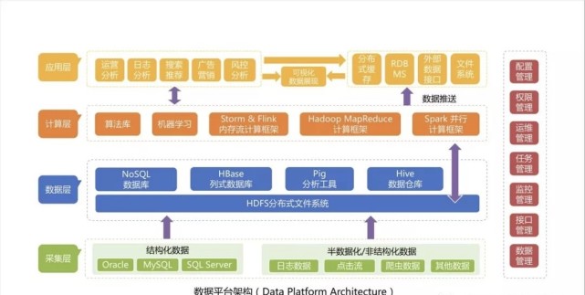 数据平台是在大数据基础上出现的融合了结构化和非结构化数据的数据基础平台,变成一个集数据接入、数据处理、数据存储、查询检索、分析挖掘等、应用接口等为一体的平台,为业务提供服务的方式主要是直接提供数据集