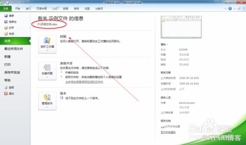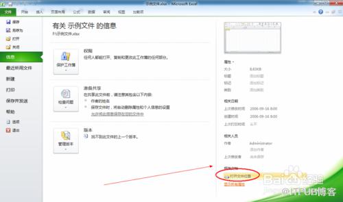 在信息子菜单下,右边窗口上方有关《XX》的信息下方显示有该excel文件的文件夹位置。