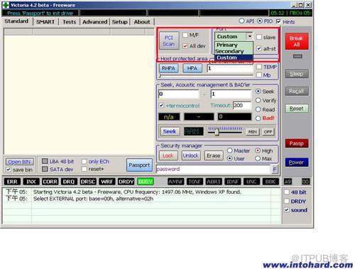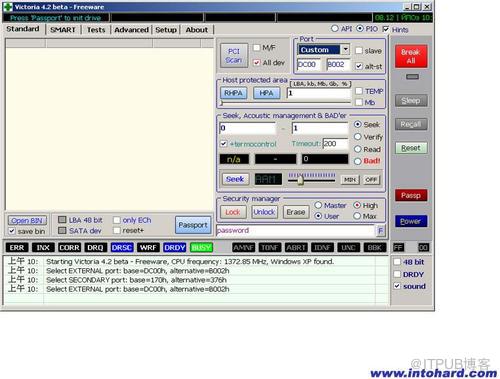 PCI SCAN:扫描SATA/ATA端口;中国硬盘基地网 intohard.comHost protected areaRHPA:取得原始LBA;HPA:设置新的LBA;中国硬盘基地网 intohard.comSecurity manager:中国硬盘基地网 intohard.comLock:SET PASSWORD 设置密码Unlock:解锁Erase:清除Master:主控制密码High:高级密码User:用户密码Max:最大长度