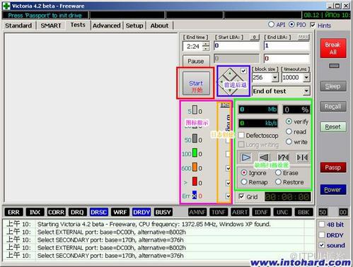 进入程序如下图: 上图中DRSC与DRDY指示灯可以看出,硬盘未准备就绪或者端口没有选择;Standard----port内选择端口;选择待修硬盘端口,选择后如下图显示;DRSC与DRDY指示灯准备就绪;port显示为我们待修硬盘端口;正确选择后,进入TESTS功能窗口;如下图:上图绿色部分设置测试方式;然后选择红色标注部分;测试将会开始;中国硬盘基地网 intohard.com绿色部分设置名词,可以参考本站MHDD说明内术语;使用ERASE/REMAP/Defectoscop这几个功能使用后都可以起到修复缺陷的功能;