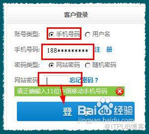 来到营业厅主页以后,你会看到登陆的界面,勾选【手机号码】,然后输入手机号码,输入你在该网站的密码,然后点击登陆即可。如果你忘记密码,或者没有在该网站注册,看下面那一步