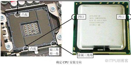 步骤3:仔细观察CPU正而,会发现某个角有一个金属三角形符号,同时在主板插座上有个角呈扃三角形状(或同样有个金属三角形符号k安装时,将CPU有金属三角形的那个角对准插座上呈扁三角形的那个角,就能确定CPU安装方向(这种方法适用于所有品牌和规格CPU的安装)。此外,在IntelLGA775、LGA1366,LGA1156架构的CPU上有两个凹口,而插座上会有两个凸起,安装时,将两个凹口和凸起对准,这样也可按正确方向安装CPU,如图3所示。