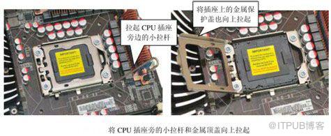 步骤1:把CPU插座旁的小拉杆向外侧稍稍拉动,并向上扳到垂直的位置,接着将插座上的金属顶盖也向上拉起,如图1所示。