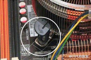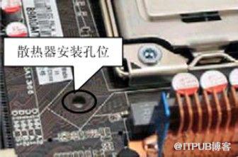 步骤6:由于CPU发热量非常大,因此,所有的CPU都必须安装专用的散热器。IntelLGA775、LGA1366、LGA1156架构的散热器一般是通过四个膨胀扣将散热器固定在主板上,如图6左图所示。