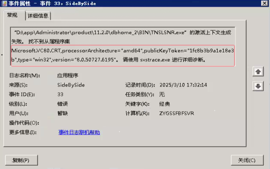 oracle11.2.0.4在windows2008环境下,打完补丁服务不能正常启动,查看事件日志