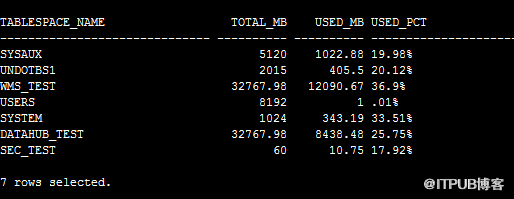SELECT total.tablespace_name, Round(total.MB, 2) AS Total_MB, Round(total.MB - free.MB, 2) AS Used_MB, Round(( 1 - free.MB / total.MB ) * 100, 2) || '%' AS Used_Pct FROM (SELECT tablespace_name, Sum(bytes) / 1024 / 1024 AS MB FROM dba_free_space GROUP BY tablespace_name) free,