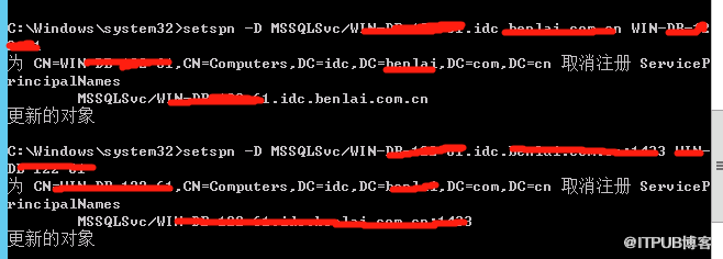 删除新节点上的 两个以MSSQLSvc打头的SPN,命令是setspn -D SPN_name Server03