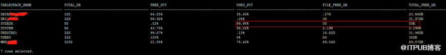 可以看到SYSAUX表空间满了,增加SYSAUX表空间。