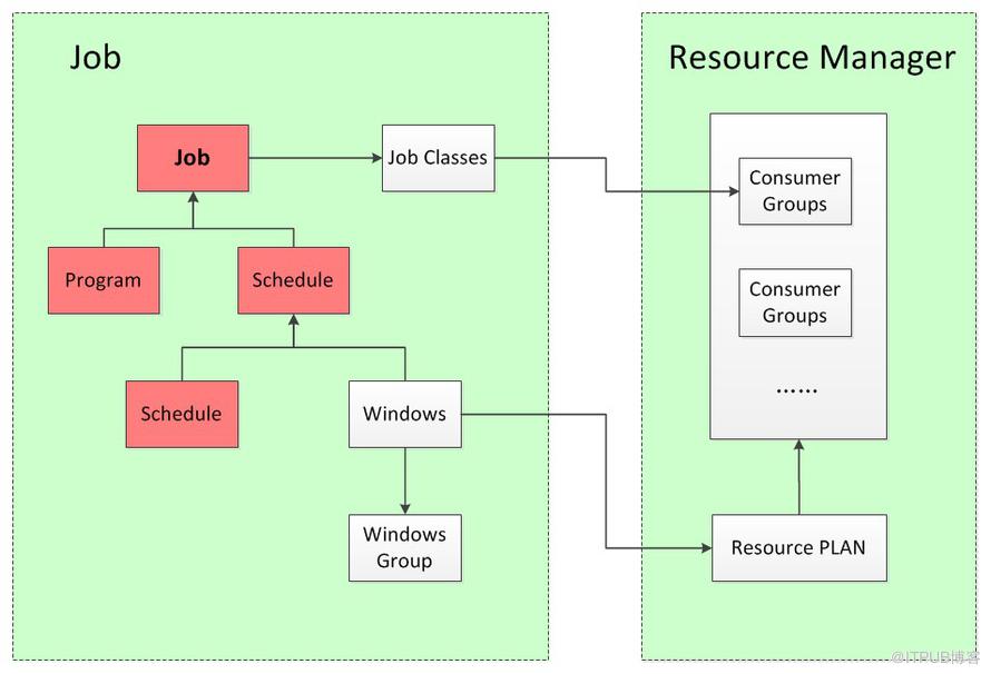 红色部分表示需要使用到的对象。一个Job被分解为了Program和Schedule,Program是调用的脚本,可以是存储过程,也可以是操作系统脚本;Schedule是调度器,可以是Schedule调度对象也可以是Windows对象,如果需要跟Resource Manager关联,那么必须选用Windows。Windows是一种更加高级级别的时间调度器。