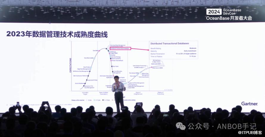 Gartner 顾总监从一个国际研究机构的角度, 数据管理技术成熟度曲线看,目前的分布式数据库刚刚经过炒作巅峰,回归理性阶段,从基础环境、管理等角度存在一个“想当然”的误区,而这些问题都需要一个很长的周期去完善, 因此判断分布式数据库技术到成熟还有5-10的时间。表示 云是分布式数据库最好的舞台。