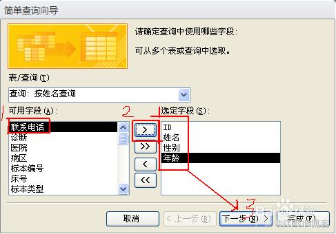 在左侧可选字段中选择需要的字段,然后加入的右侧的选定字段中,点击下一步