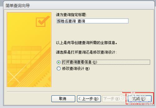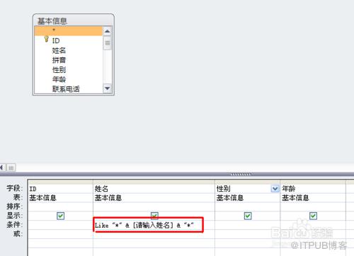 在姓名下的条件栏中输入查询语句,Like "*" & [按姓名查询] & "*",然后保存关闭