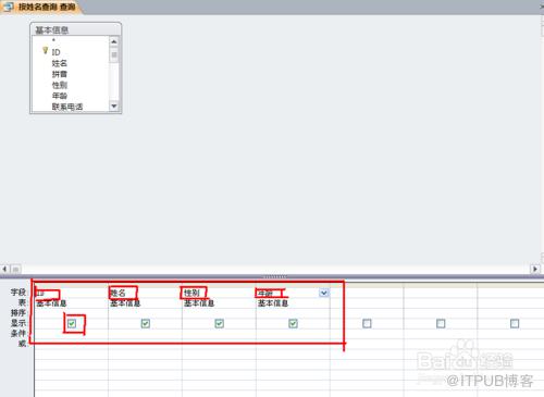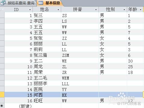 1.首先要建立起表,里面的内容要自己填好,我的表名叫基本信息 我的里面是ID,姓名,年龄,性别,然后点击查询向导