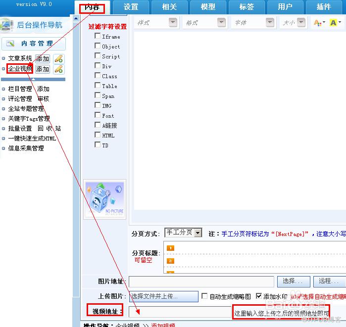 如下图依次点击内容-企业视频-添加按钮,在编辑器最下边可以看见第6步新建的视频地址这个字段对应的文本框