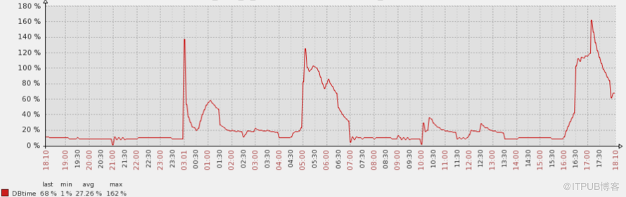 而DB time的情况呢,印象中么有报负载突然暴增的短信报警。