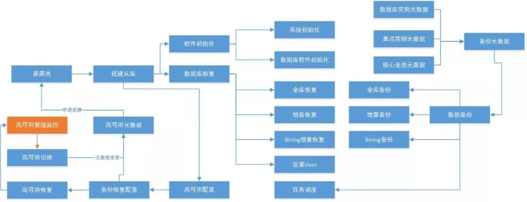 所以惭愧的是,一直在说自动化,但是现在连半自动化还没有做好。这怎么行,所以第一个坎就是要想明白,理清楚,这个事情占到前期的比重较高,如果这个地方理顺了,后面的功能也是如法炮制,所以我画了一个简单的图,把高可用的部分和系统初始化,备份恢复简单串联起来。
