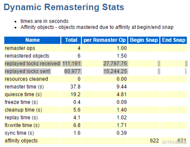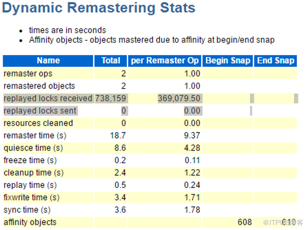 这是正常时段的Dynamic Remastering Stats。对比可以发现replayed locks sent在正常时段值为0,而在问题时候,每次DRM对应15,244.25次操作。