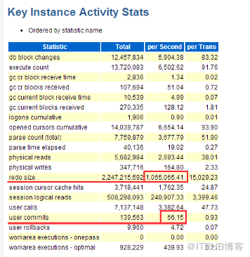在故障时间段,数据库的提交次数达到每秒的66.15次,redo产生每秒在1M左右,提交次数非常大,频繁提交在一定程度上严重影响了log file sync。