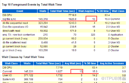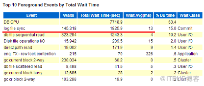 故障期间,在分析2节点的AWR上,我们看到2节点出现较多的 log file sync等待事件: