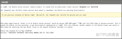 从USLA HEAP的使用情况( 1638 4KB pages也就是 6.5MB)可以判断进程私有使用量已经接近oracle官方提示的1800 4KB pages 也就是 7MB左右。这是oracle官方公布的一个bug 10190759。 解决方法如下: