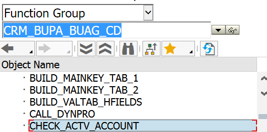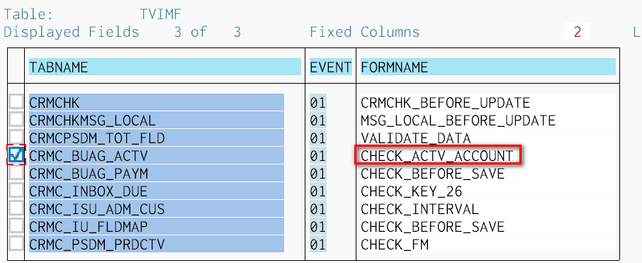 In tcode SE54 I can find the function group for table CRMC_BUAG_ACTV is CRM_BUPA_BUAG_CD, and in that function group I can find the subroutine CHECK_ACTV_ACCOUNT.
