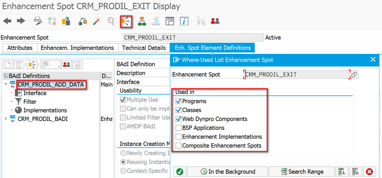 Suppose I know the BAdI definition CRM_PRODIL_ADD_DATA and I would like to find the customizing path in SPRO where I can also manipulate it. Unfortunately the where used list in SE18 does not support to search BAdI definition by customizing activities.