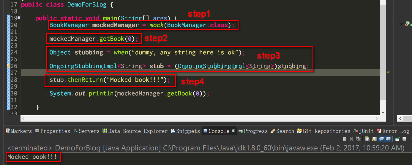 System.out.println(mockedManager.getBook(0));Since all the previous four steps for mock are done, we expect this time, the findAnswerfor will really return something.