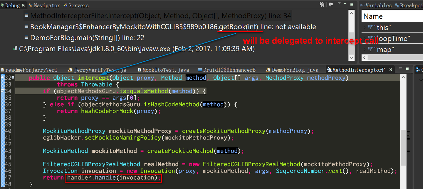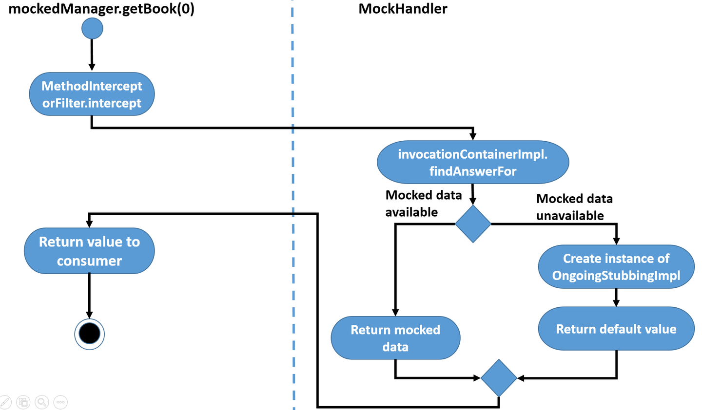 Step2: mockedManager.getBook(0): Since we call getBook on the mocked class, the original implementation of this method can never be called again. When you click F5 to debug into this method, you can find the method call of getBook is intercepted into Mockito framework code: