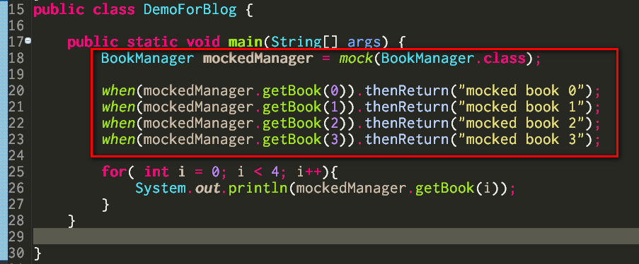 The magic is located in line 18 ~ 23. First in line 18 a proxy class is generated based on BookManager which is to be mocked, then line 20~23 we told the Mockito “when the method getBook with specified argument ( 0, 1, 2, 3 ) are called, please return given mocked data “mocked book {index}” accordingly.