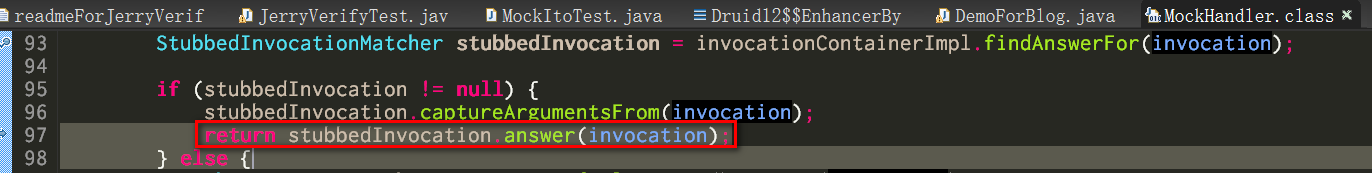 In line 93, Mockito will check whether there is available mocked data ( In Mockito the terminology for “mocked data” is “answer” ) for current metod call in method findAnswerFor. If available, go to IF branch in line 97 to return mocked data, or else return default answer, in my example I don’t prepare any mocked data for getBook, so it simply returns null.