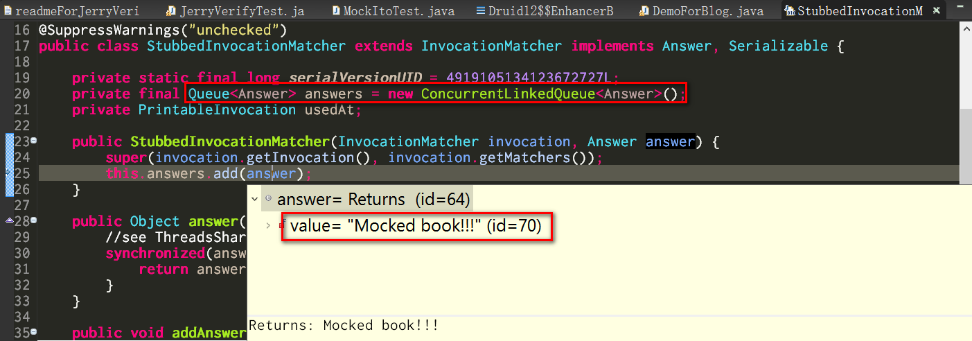 Step4: stub.thenReturn(“Mocked book!!!”); This line feeds the mocked data “Mocked book!!!” for method getBook. The answer is inserted to a ConcurrentLinkedQueue.