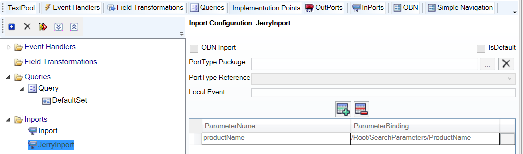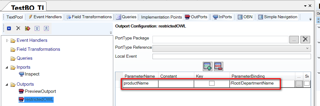 (3) Create a new outport in Thing Inspector, bind the parameter productName with the transient field DepartmentName filled in step 1.