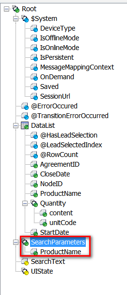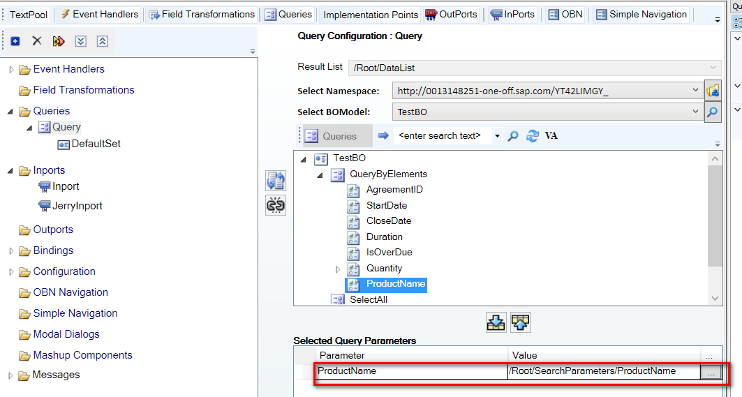 Bind the query to QueryByElements modelled in TestBO and bind the query parameter ProductName to the field ProductName under SearchParameters.