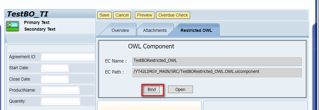 Create a new tab in Thing Inspector and drag the new OWL into it. Click Bind button: