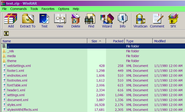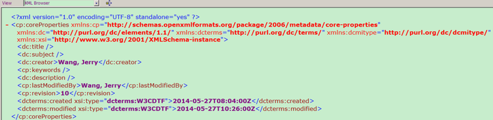 According to Office OpenXML protocal, after you change the file extension from “.docx” to “.zip”, its icon changes to an archive file and thus could be opened via winrar. All information about my sample document are spreaded inside a series of xml files in the archive file ( plus media file like picture, music and video if the word document has such one).