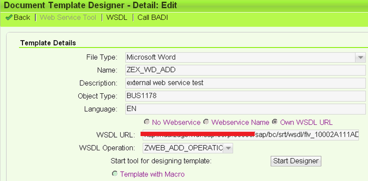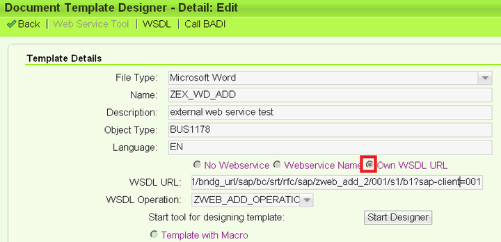In document creation UI, choose radio box “Own WSDL URL”, paste your web service WSDL URL to input field and press entry key, then your web service operation will appear in drop down list automatically. Choose your operation and click button “Start Designer”. If you meet with 401 unauthorization error message after enter key is pressed, refer to this document about solution:
