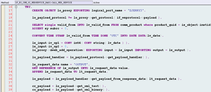 DATA: lo_proxy TYPE REF TO co_zweb_add_21,ls_input TYPE zweb_add_operation,ls_output TYPE zweb_add_operationresponse,lo_payload_protocol TYPE REF TO if_wsprotocol_payload,lo_payload TYPE REF TO if_ws_payload,lo_payload_handler TYPE REF TO if_ws_payload_handler,lt_request_data TYPE prx_t_param,ls_request_data TYPE prx_s_param,lv_valid_from TYPE comt_valid_from.