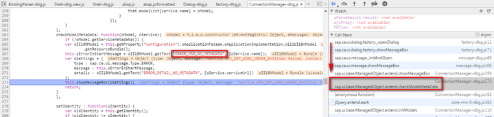(2) Repeat the operation to trigger the breakpoint. When breakpoint is triggered, check the inner callstack and then we can know the error dialog is poped up because of the failure metadata load in function checkModelMetaData: