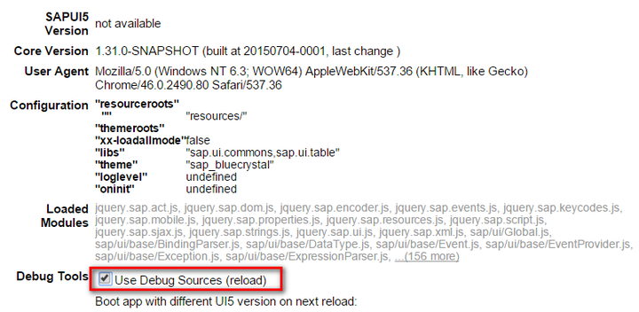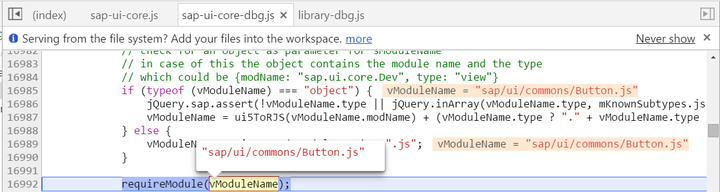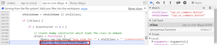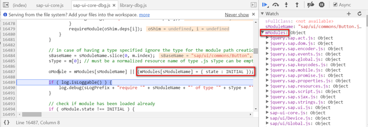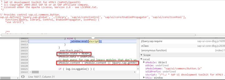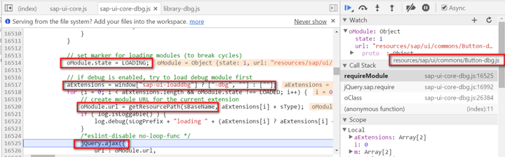 – Line 16514: mark module state as LOADING – Line 16517: determine whether we need to load the normal version of js, or the debug version. The flag for debug mode is stored via the field sap-ui-loaddbg in global object window. – Line 16520: get url of module converted from module name – Line 16525 use AJAX to load the module