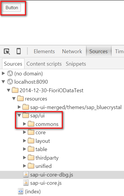 Run this simple application in your webserver and you see Button as expected. In development tool, Sources tab, you see lots of js and css files are loaded by framework automatically. To be exact, they are loaded by sap-ui-core-dbg.js if you switched on debugger mode.